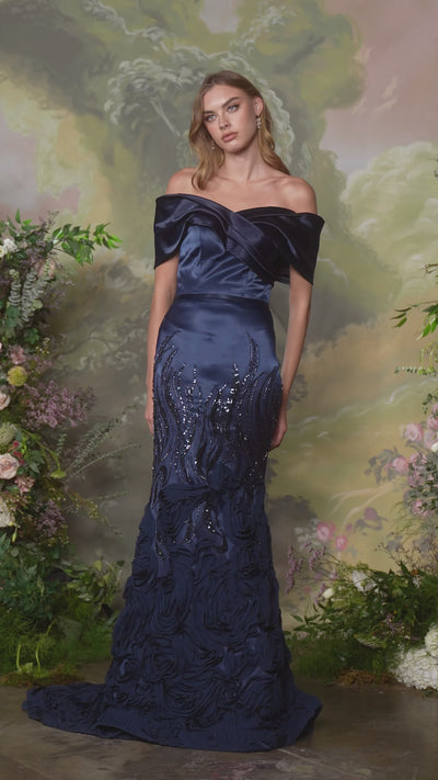Make a bold and elegant statement in this couture-inspired mermaid gown. Designed with an off-the-shoulder pleated satin neckline that beautifully frames the shoulders, the fitted bodice hugs through the hips to enhance your silhouette. Cascading sequin embellishments flow into a rosette-textured skirt, adding rich dimension and a touch of drama. The adjustable lace-up back ensures a sculpted, flattering fit, perfect for red carpet moments, formal galas, or mother of the bride celebrations.