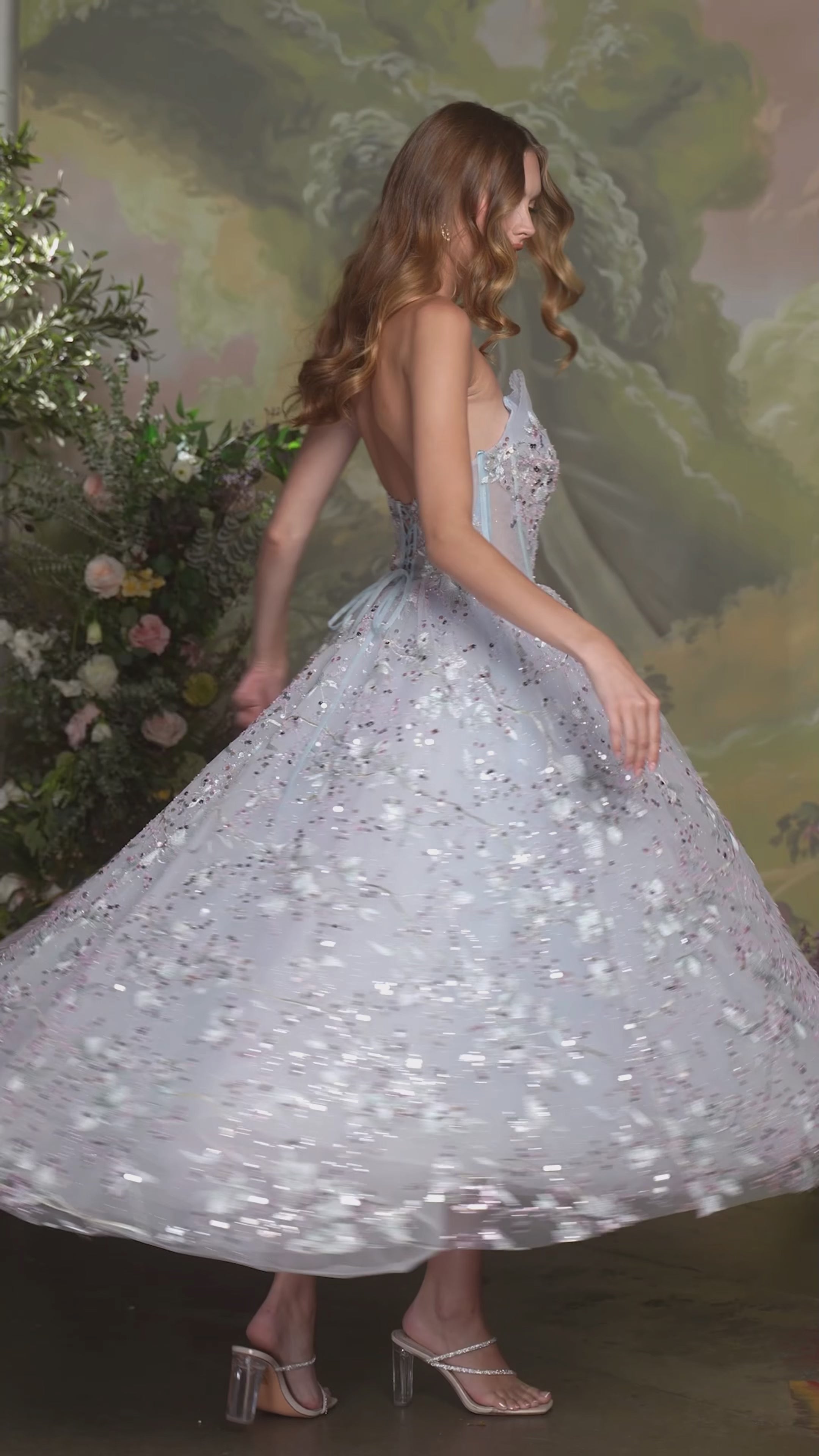 This romantic A-line gown captures a fairytale essence with its soft pastel hues and shimmering floral embroidery. The strapless sweetheart neckline and structured bodice flatter the figure, while the delicate sequin and bead embellishments glisten over layers of airy tulle. Finished with a mid-length skirt that moves gracefully with every step, this gown is a perfect choice for garden parties, formal soirées, or any whimsical celebration.