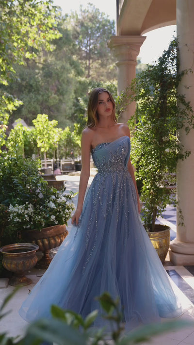 Designed for starlit nights and ballroom entrances, this dazzling ball gown features a sculpted strapless neckline and a shimmering beaded bodice that melts into a dreamy, layered tulle skirt. The glittering branch-like beadwork adds texture and movement, while the corseted illusion bodice provides subtle structure and support. Available in multiple colors this gown makes a graceful, modern statement.