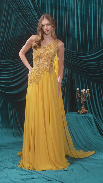 This regal gown captures timeless glamour with its one-shoulder neckline and intricately beaded floral embellishments. The sheer bodice transitions into a flowing chiffon skirt that moves effortlessly with every step, while the elegant cape drape adds a dramatic, goddess-like touch. Designed to flatter with a natural waist and soft silhouette, this gown is a stunning choice for galas, red carpet events, or any formal occasion where sophistication meets allure.