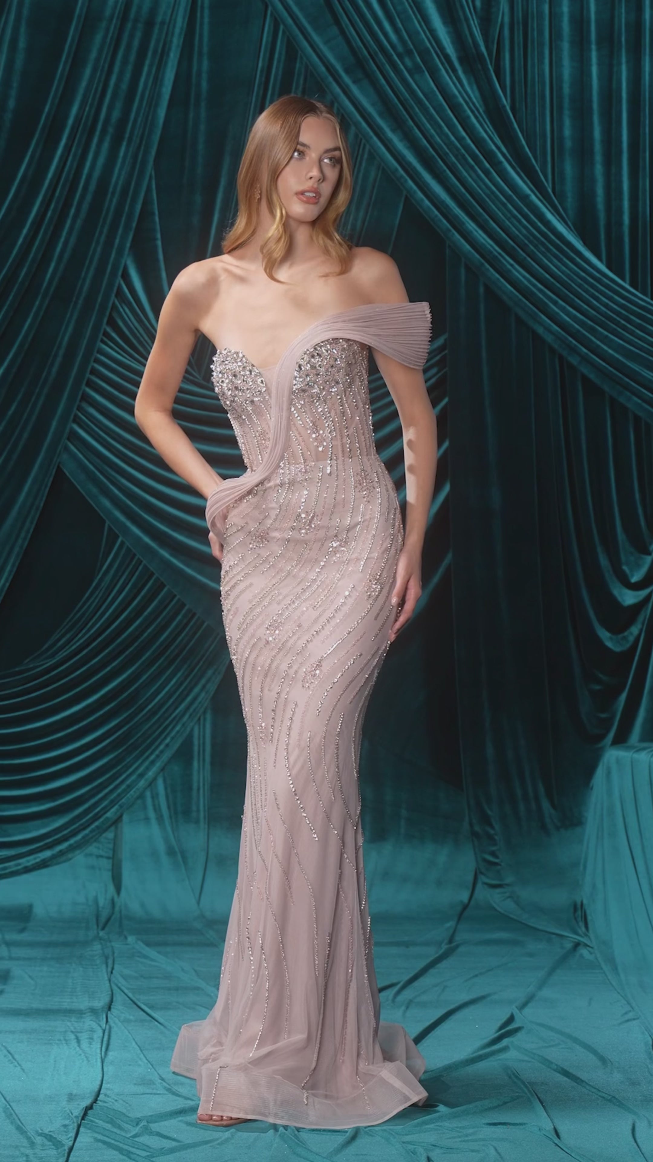Ethereal and opulent, this fitted gown blends romantic sparkle with sculptural elegance. Featuring a sweetheart neckline and an asymmetric pleated sculptural wrap detail, the bodice shimmers with crystals and beadwork for a couture-level finish. Softly cascading lines of sequins flow over the silhouette, creating a radiant, elongated effect. Crafted with a contouring structure and supportive fit, this gown brings high-glamour allure to any formal occasion.
