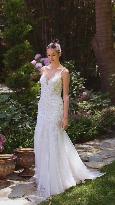 Effortlessly enchanting, this fit-and-flare wedding gown is the perfect balance of modern glamour and romantic detailing. The fitted bodice features a deep illusion neckline with soft floral applique that cascades down into the sheer layered tulle skirt. Beaded embroidery adds subtle shimmer throughout, while the lace-up corset back ensures a beautifully contoured silhouette. Finished with delicate straps and a flowing train, this gown is ideal for the bride seeking elegance with a contemporary edge.