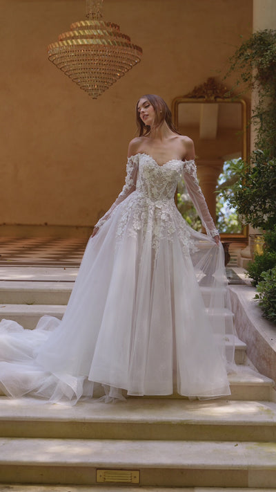 This romantic ball gown evokes fairytale elegance with its dreamy silhouette and intricate detailing. The gown features an off-the-shoulder neckline with sheer illusion sleeves and a corseted bodice adorned in hand-placed floral appliqués. Layers of glittered tulle cascade into a soft, voluminous skirt, adding shimmer and graceful movement to every step. Designed for the modern bride seeking both romance and sophistication, this gown blends timeless charm with delicate couture accents.